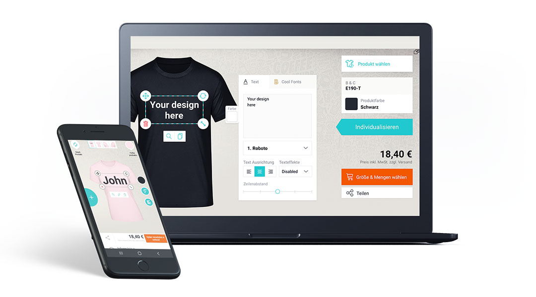 Use vaste library of ready made motifs for your designs. They may be combined with your own texts or uploaded graphics and guarantee perfect print quality. They are categorized and searchable via tags. Create your own motives and extend your offering.